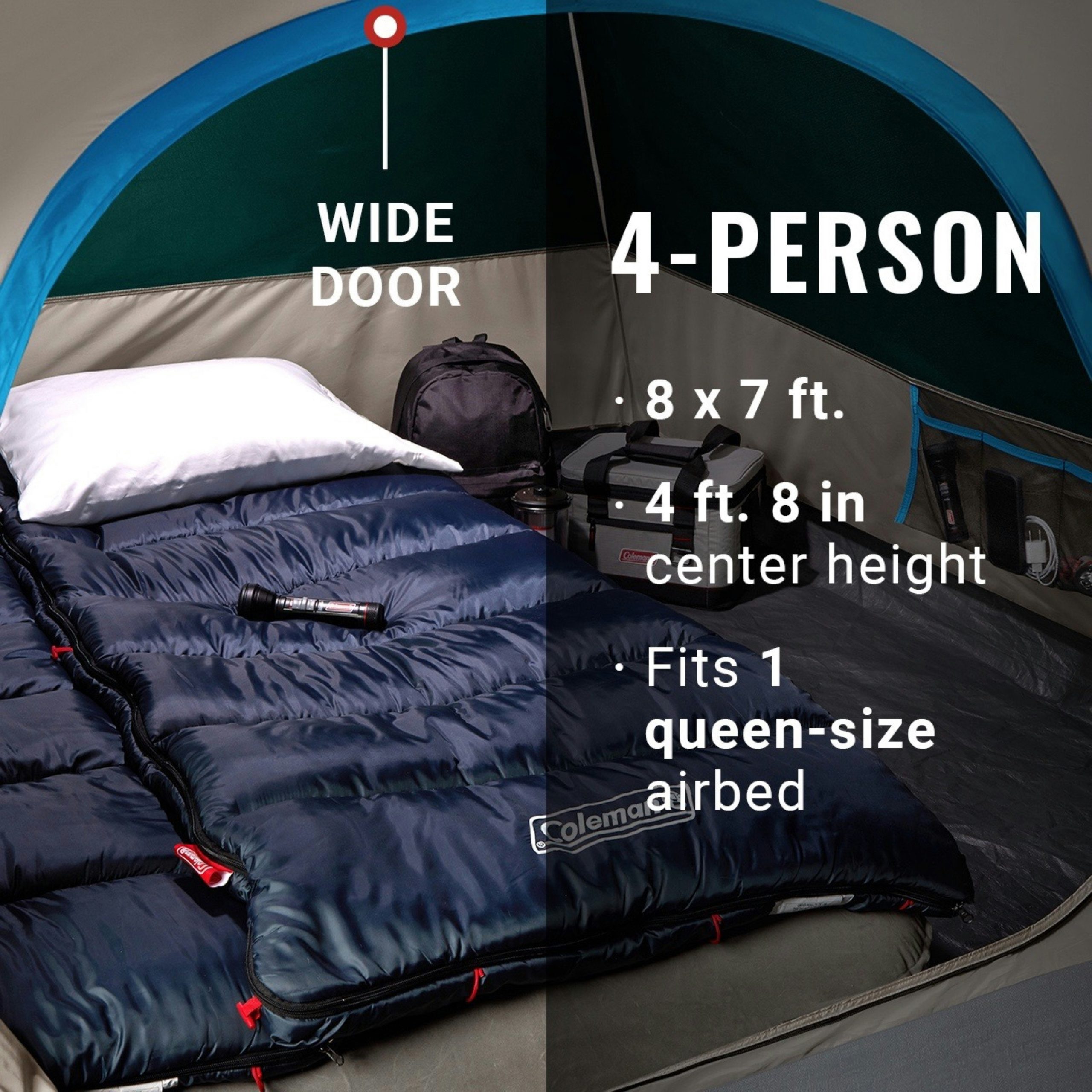 With a quick setup under 5 minutes, the Skydomeâ„¢ Camping Tent lets you enjoy more time with friends and family on your next camping trip. There is plenty of room to stretch inside the spacious interior thanks to the nearly vertical walls that offer 20% more headroom than a traditional Coleman® dome tent. Plus, a wide door design means you can move air beds, sleeping bags, and other gear in and out with ease. Downpour in the forecast? Not to worry, the WeatherTecâ„¢ system’s tub-like floor, patented welded corners, and inverted seams help keep you and your gear dry. This 4-person tent’s compact size makes it a great choice for car camping or backpacking adventures. Skydome tents are available in a range of sizes (2-person, 4-person, 6-person, or 8-person), with or without Dark Roomâ„¢ technology.