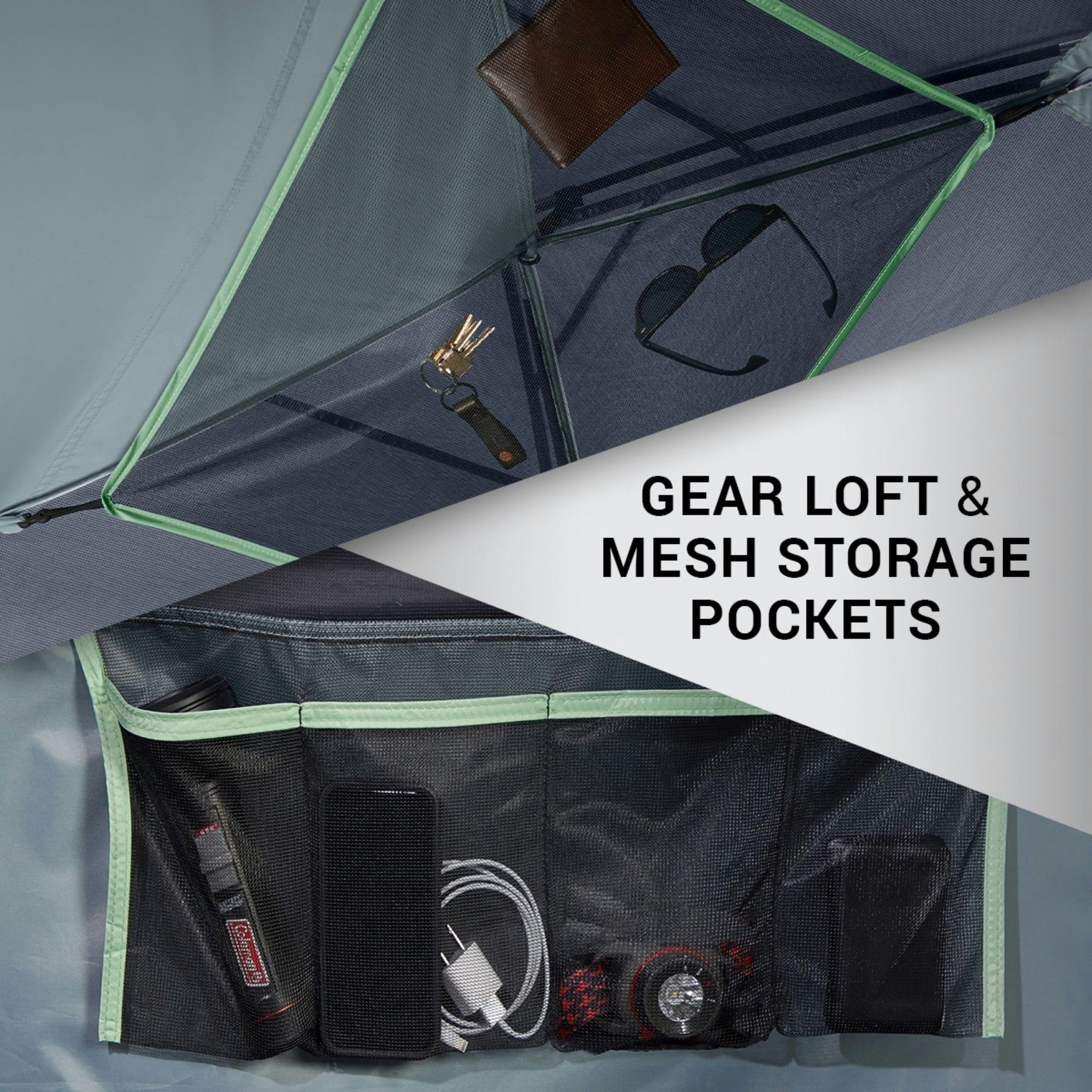 • Mesh storage pockets and a gear loft keep small items organized