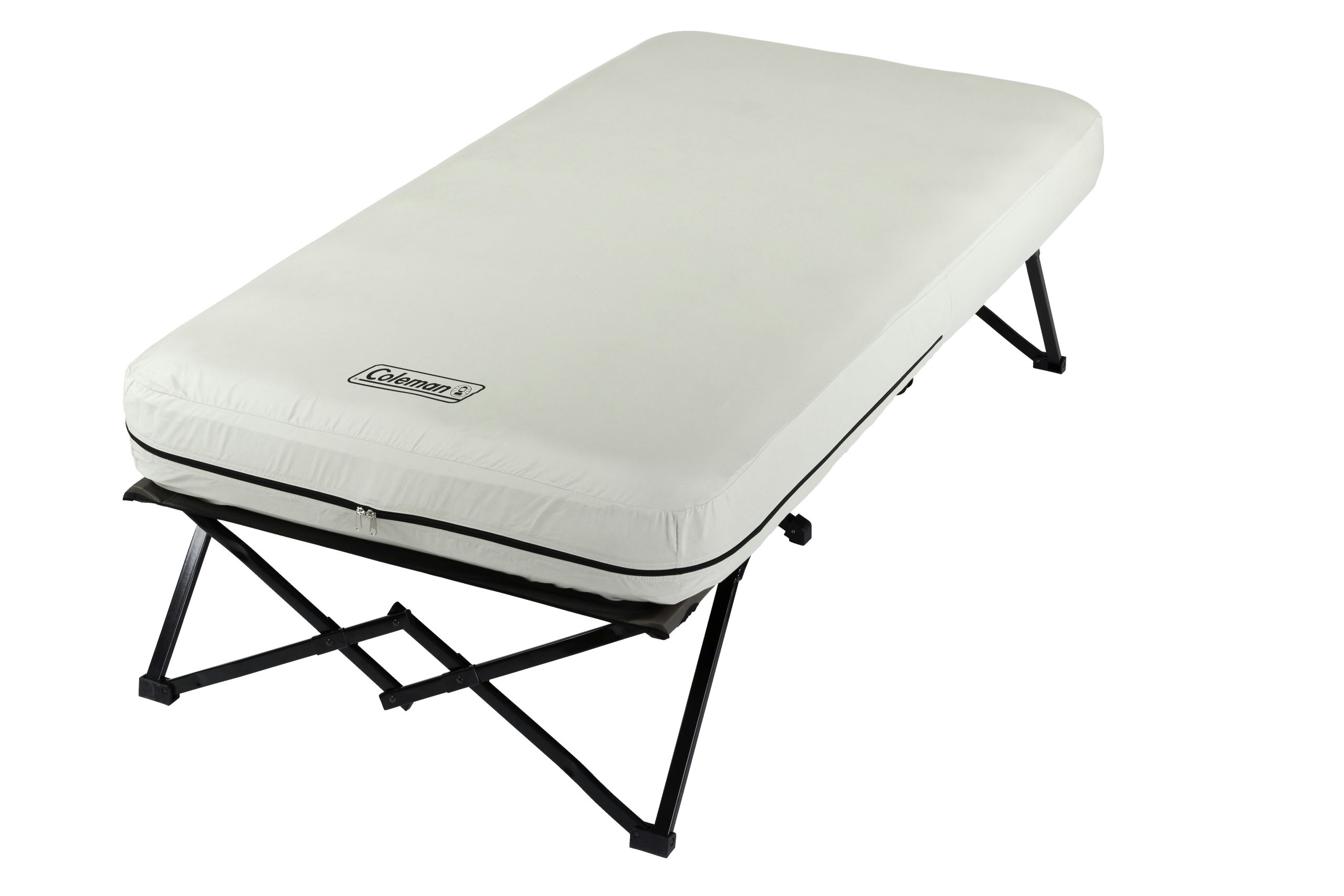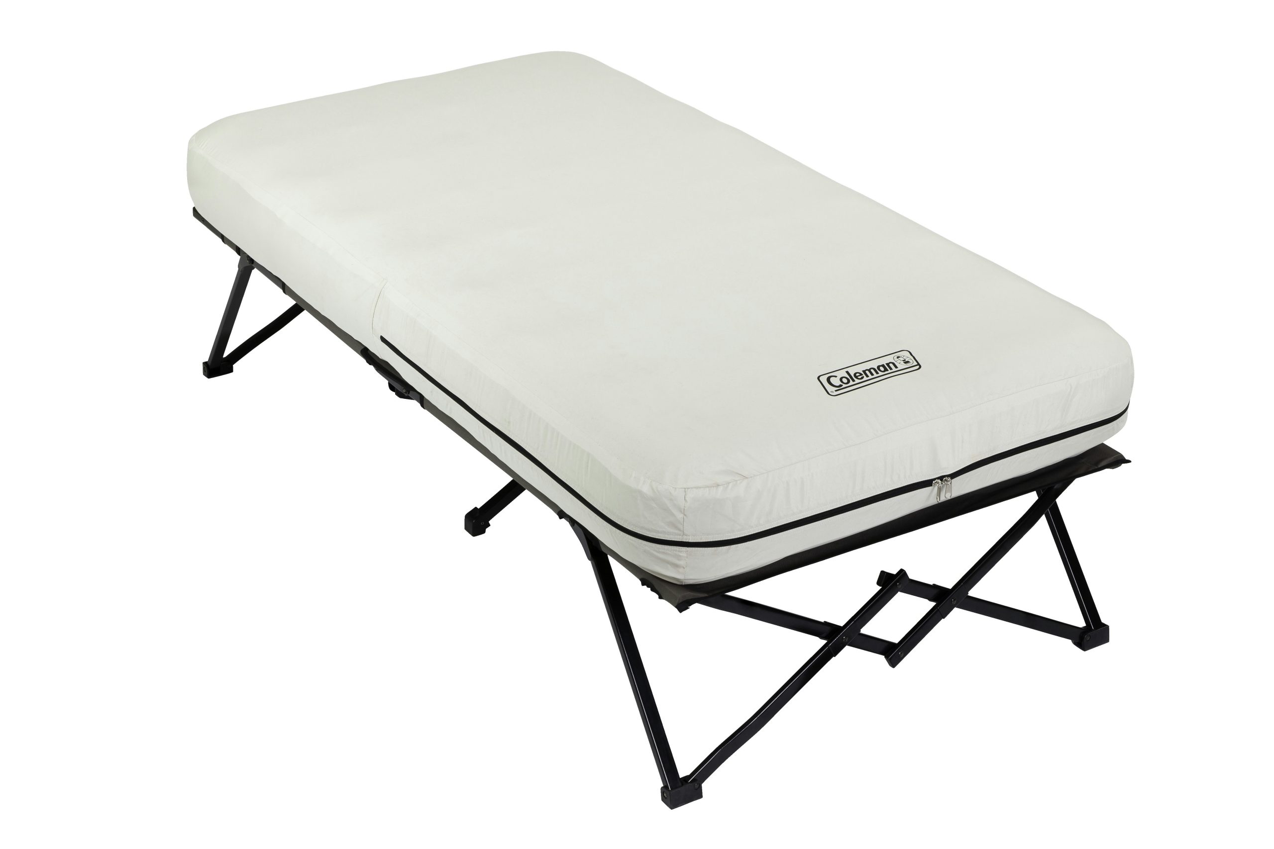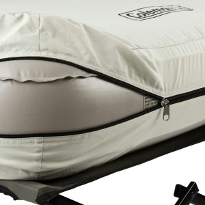 Wherever adventure leads, enjoy the elevated comfort of the Coleman® Camping Cot with Side Tables, Air Mattress & Battery Pump (4 D-cell batteries sold separately). The air bed stays inflated all night thanks to the leak-proof AirTight® system, and its ComfortStrong™ coil construction offers better support. For easy access during the night, place a flashlight or water bottle on the pull-out side tables complete with cup holders.