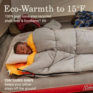 Outdoor enthusiasts rely on Coleman® sleeping bags for the care that goes into every detail. And like you, we also care about the environment. That’s why our Arch Bayâ„¢ cold-weather sleeping bags are made with 100% post-consumer-recycled polyester in the shell, liner, and Ecothermâ„¢ fill. Insulated to keep you warm in temps as low as 15°F and it’s sized for campers up to 6′ 5″ tall. The contoured design provides extra space for your head and pillow. Our ZipPlow zipper offers easy, snag-free use and the Thermolockâ„¢ draft tube keeps cold air out. Soft Comfort Cuffâ„¢ trim frames the face. And when it’s time to head home, Roll Controlâ„¢ holds the bag straight, and our Quick Cordâ„¢ secures without tying. 84†x 39†size. Machine washable. 5-year warranty.