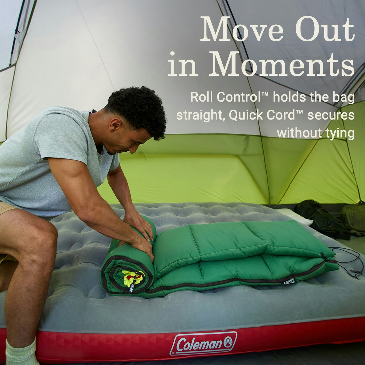 Outdoor enthusiasts rely on Coleman® sleeping bags for the care that goes into every detail. And like you, we also care about the environment. That’s why our Arch Bay™ cold-weather sleeping bags are made with 100% post-consumer-recycled polyester in the shell, liner, and Ecotherm™ fill. Insulated to keep you warm in temps as low as 30° F this bag is also loaded with premium features. The contoured design provides extra space to keep your head and pillow off the ground. Our ZipPlow zipper offers easy, snag-free use and the Thermolock™ draft tube keeps cold air out. Soft Comfort Cuff™ trim frames the face for warmth. And when it’s time to head home, Roll Control™ holds the bag straight, and our Quick Cord™ secures without tying. 81†x 33†size. Machine washable. 5-year limited warranty.