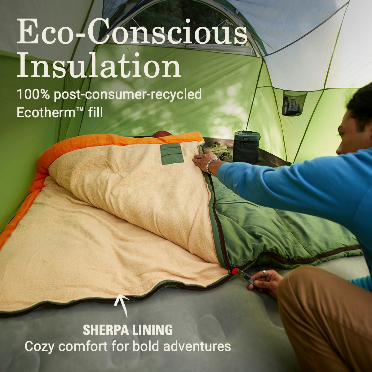 The Coleman® Big Game™ 0°F cold-weather sleeping bag—luxurious warmth, sized for the Big & Tall. Ecotherm™ insulation is made from 100% post-consumer-recycled fill and delivers warmth in cold-weather conditions. Constructed with a natural cotton shell for durable wear, a soft sherpa lining, and proportions that fit campers up to 6’5†tall. And because this is a genuine Coleman sleeping bag it’s built smart. The premium 2-way zipper operates snag-free and retains heat, thanks to ZipPlow innovation and the Thermolock™ draft tube keeps cold air out. A handy interior pocket makes small items like cell phones and keys easy to locate, even in the dark. And when it’s time to head home, the tie-free Quick Cord™ make packing up simple. 84†x 40†size. Machine washable. 5-year limited warranty.