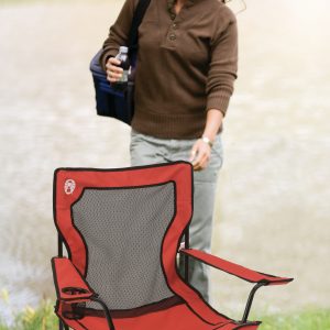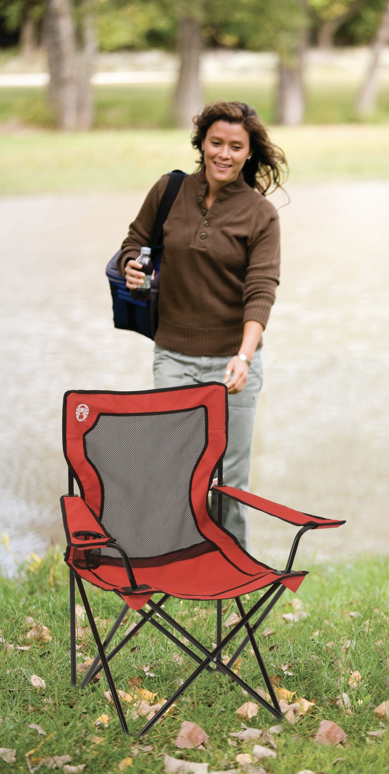 Take comfort with you to the campsite, BBQ or picnic with a Coleman® Broadbandâ„¢ Quad Chair. The mesh back allows the breeze to cool you on hot days while you enjoy a refreshing drink from the convenient mesh cup holder. The strong steel frame will make sure you’ll always have a great seat, season after relaxing season. When the fun is done, the chair easily folds up into a carry bag for easy transport and storage.