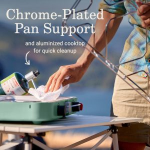 Level up your food game with the Cascadeâ„¢ Collection. Perfect for those times when trail mix just won’t cut it, the Cascade 222 2-Burner Camping Stove makes it easy to cook great meals outdoors. Its recessed carry handle makes it portable so you can bring along to the campsite. Ready to head home? Its aluminized steel cooktop and removable chrome-plated pan support makes cleanup quick.