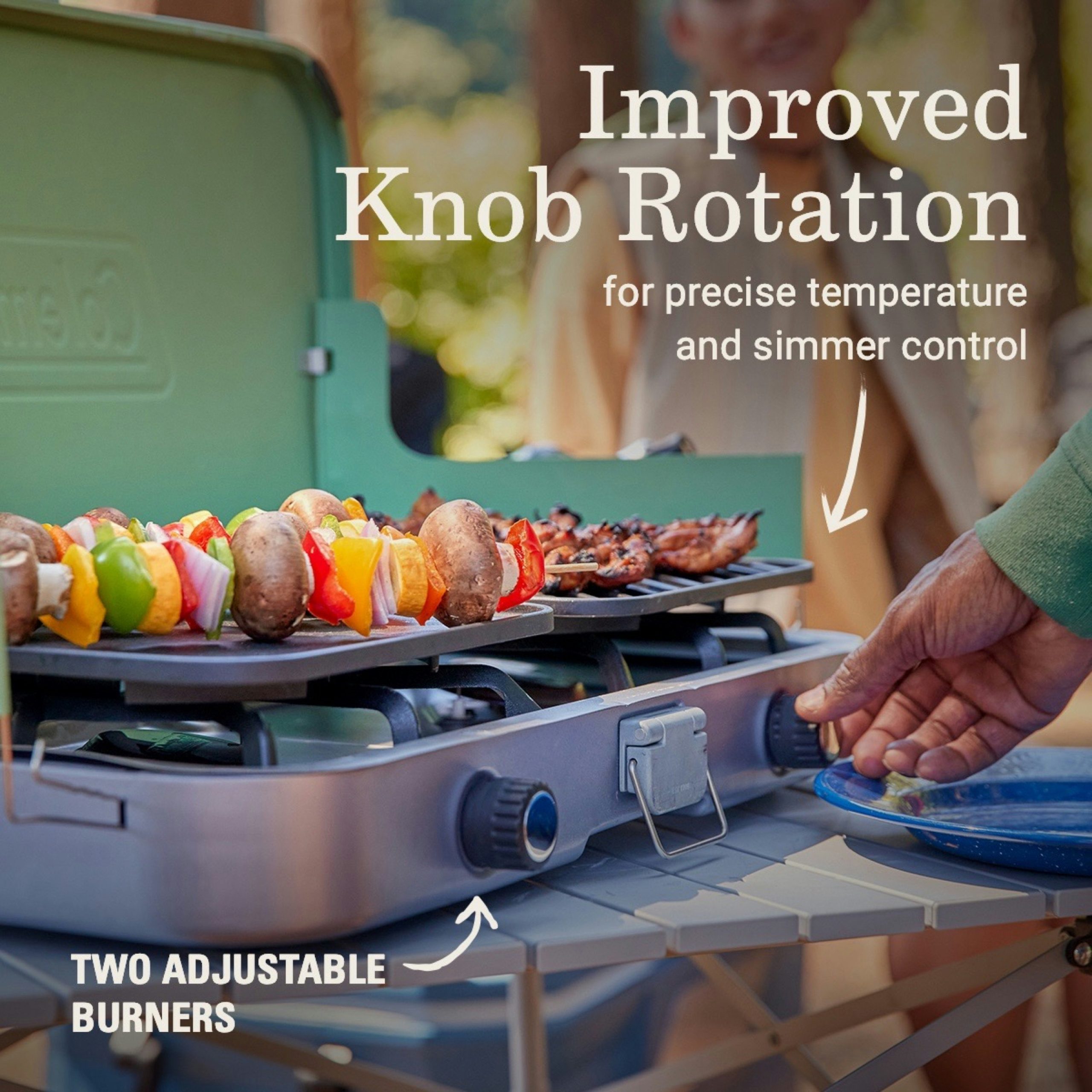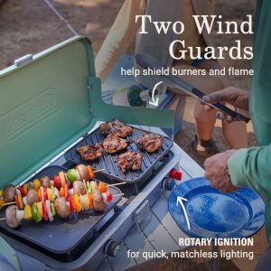 • IMPROVED COOKING CONTROL: Improved knob rotation for precise temperature and simmer control of 2 adjustable burners; rotary ignition for quick, matchless lighting