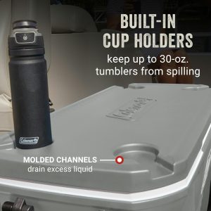 • Cup holders with drain molded into lid keep drinks from spilling; fit up to a 30-oz. tumbler