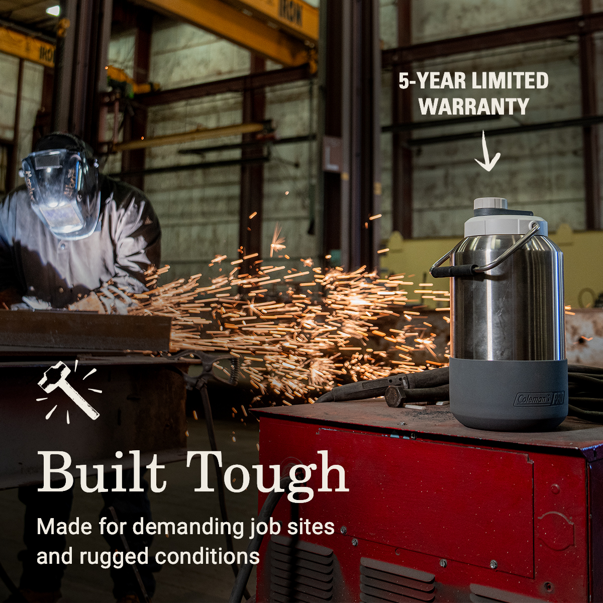 Coleman Pro is gear that works hard like you. It is purpose-built for everyday use in the most demanding environments. The Coleman Pro 1 Gallon Jug is built from durable copper-plated stainless steel and topped off with a fully insulated lid so your drink stays cold all day in the hot sun. Backed by a 5-year limited warranty, this water jug is designed with smart extras like a tethered leakproof cap that’s easy to handle in work gloves and won’t get away even if you drop it. The stainless steel water bottle’s silicone boot helps it stay put when you set it down and then pops off for easy cleaning in the dishwasher. An oversized handle makes for comfortable hauling.