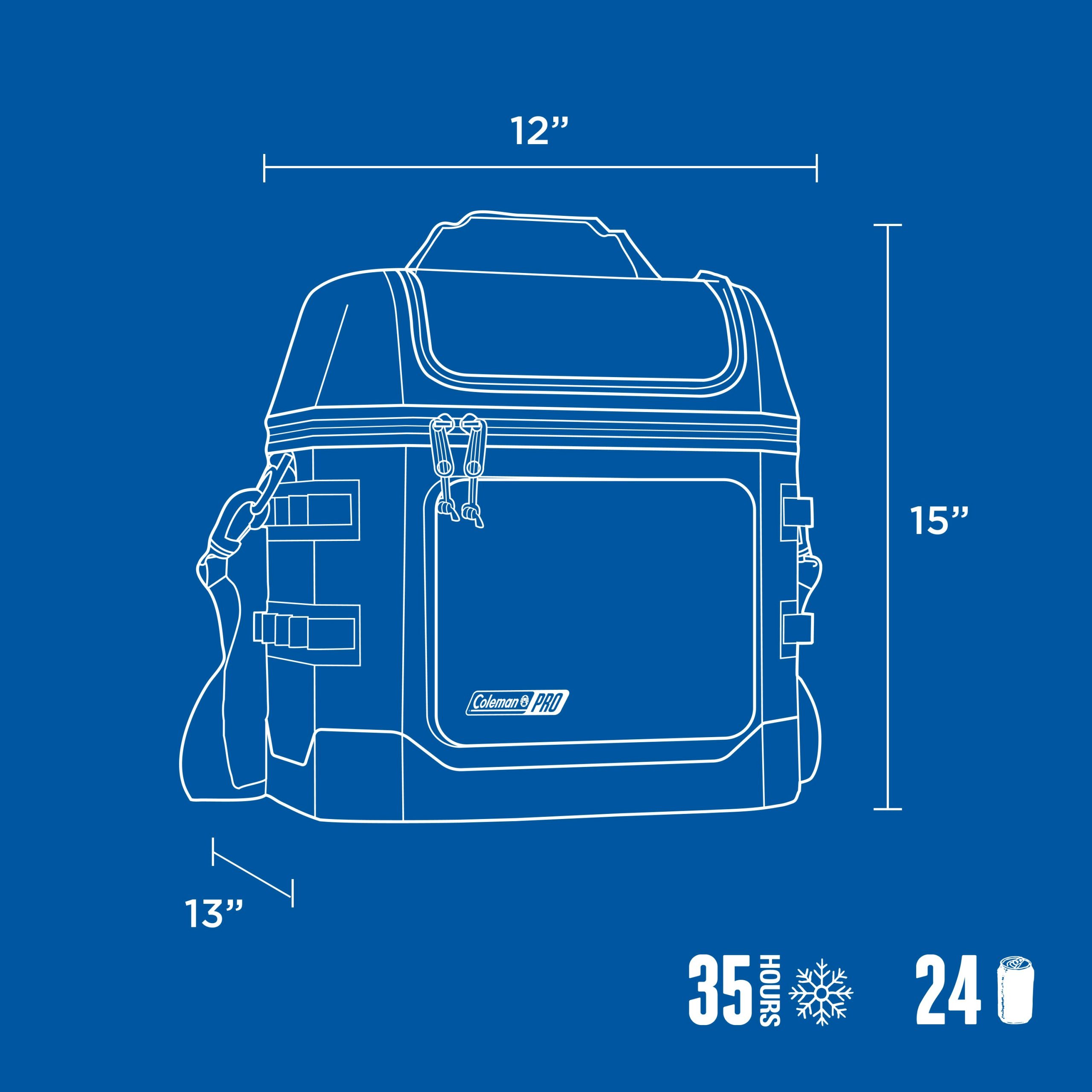 You work hard for your time off. You deserve gear that goes above and beyond. Meet the Coleman Pro series, designed for those who expect more. Combining on-the-go durability with go-anywhere flexibility, this 24-can soft cooler stays cold for up to 35 hours thanks to a fully insulated lid and body. Use its padded carrying strap to comfortably trek from backyard to beach to tailgate to sidelines, while the oversized zipper reduces snags and boosts long-term resilience. The antimicrobial liner helps prevent odor, mildew, and mold.* Best of all, these built-to-last features are backed by our 3-year limited warranty, so you can confidently bank on Pro performance for all your trips to come.