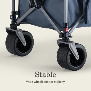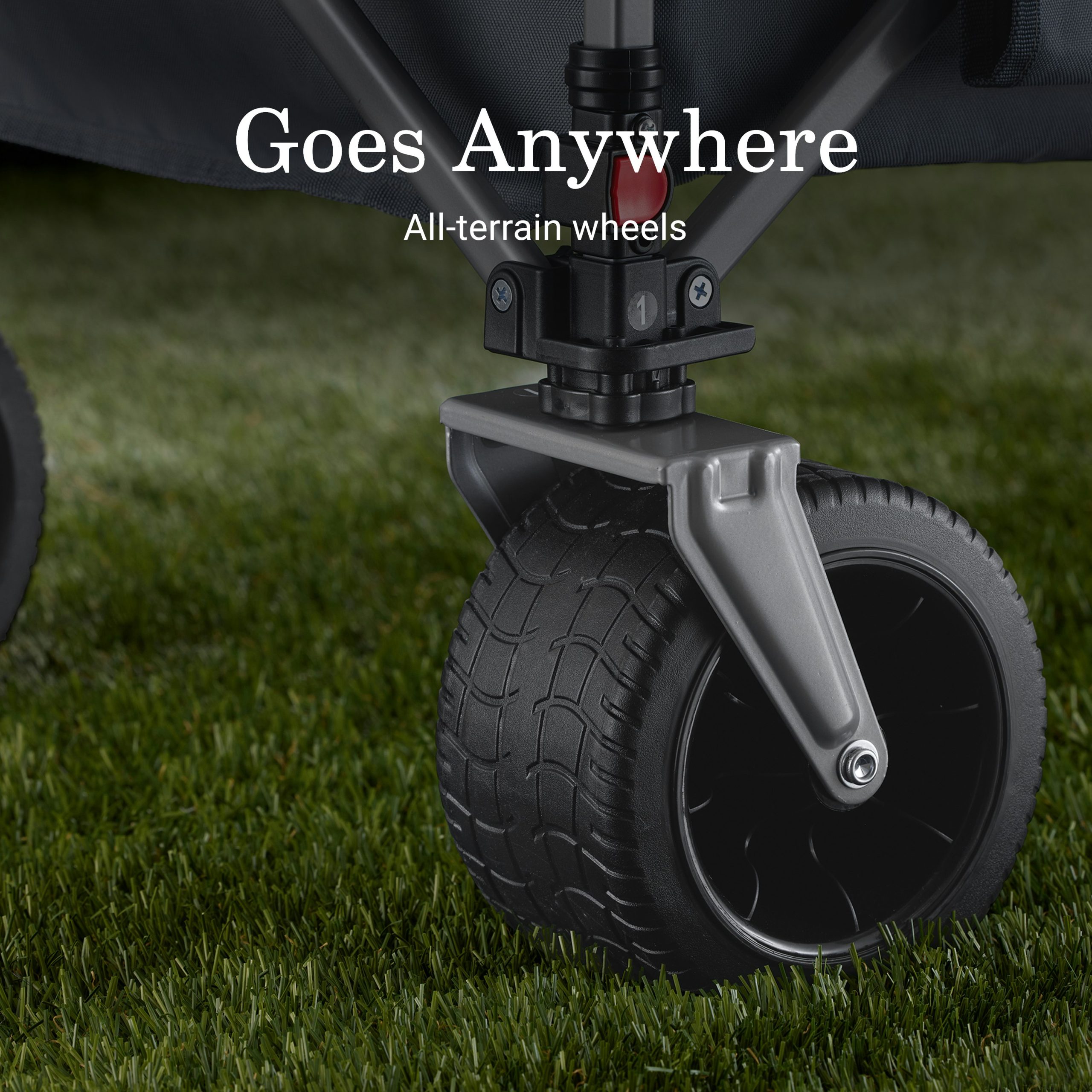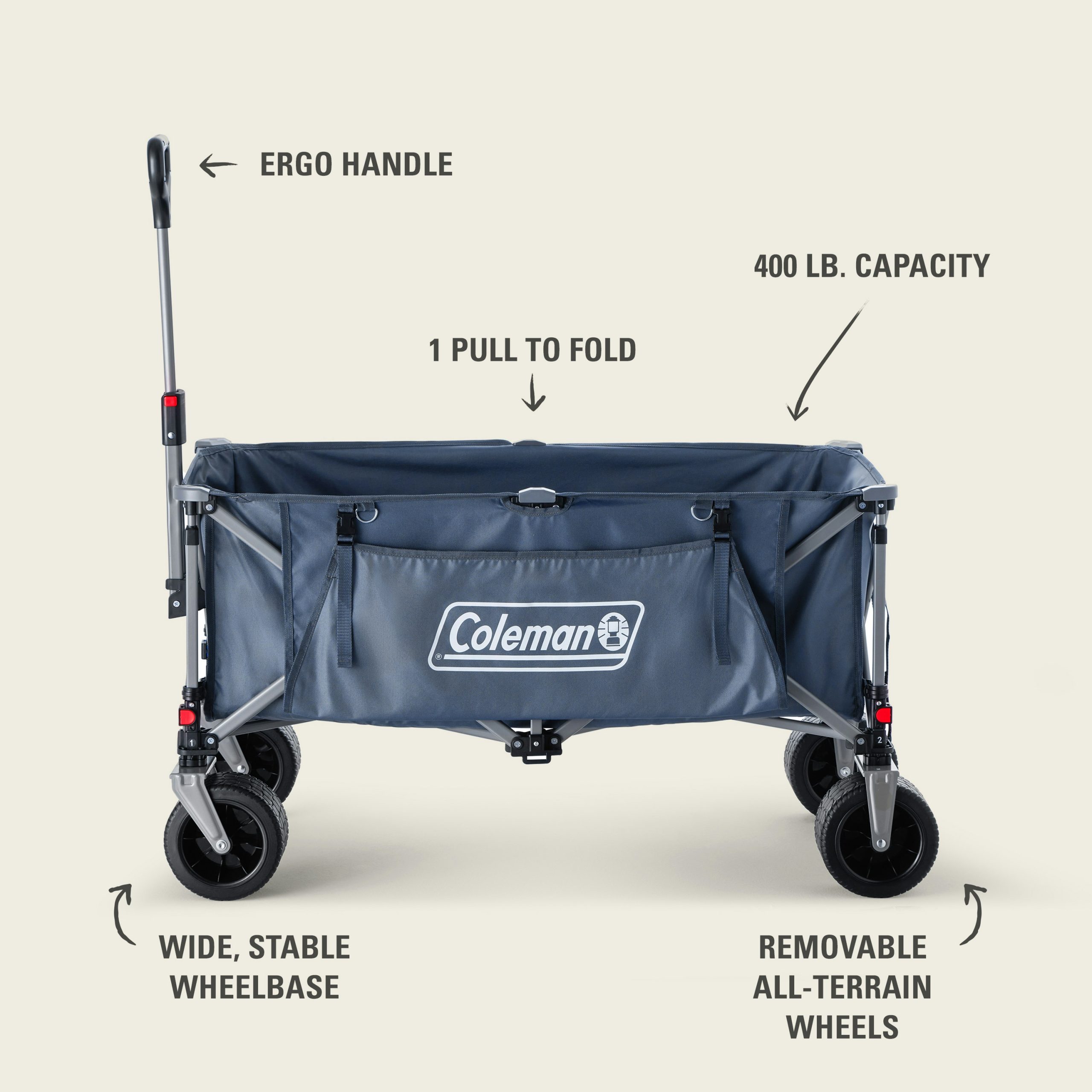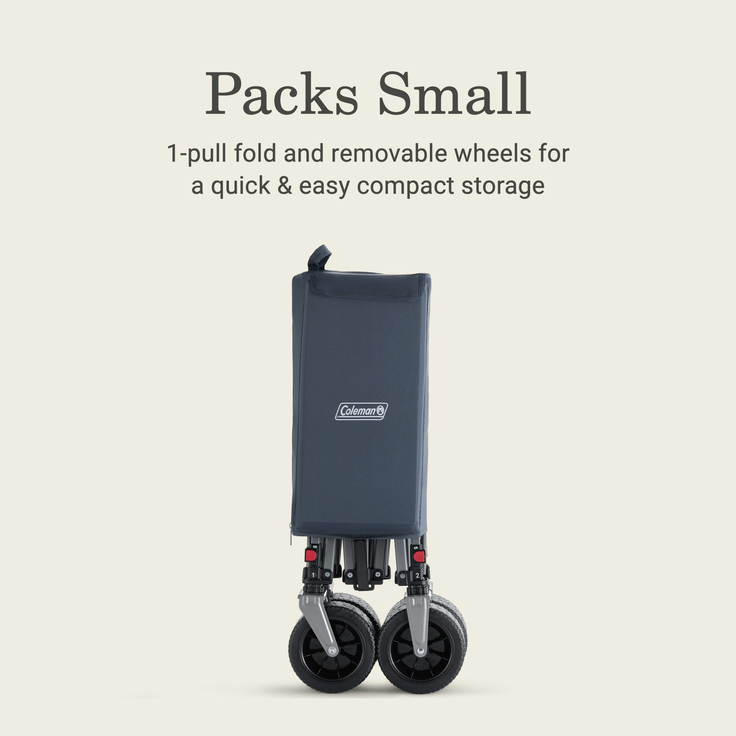 Grab the Coleman® XL Wagon out of your closet, pop it open with one pull, and load it up with up to 400 pounds of gear. This workhorse collapsible wagon can handle a heavy cooler packed with ice and drinks and still have capacity to spare. And between uses, it collapses to just 20% of its open size for easy storage. All-terrain wheels with a wide base make moving heavy loads in this folding wagon a breeze while an ergonomic handle keeps your hand comfortable. If room is tight in your camper or car, you can pull the wheels off the XL Wagon after you fold it down for even more compact packing.