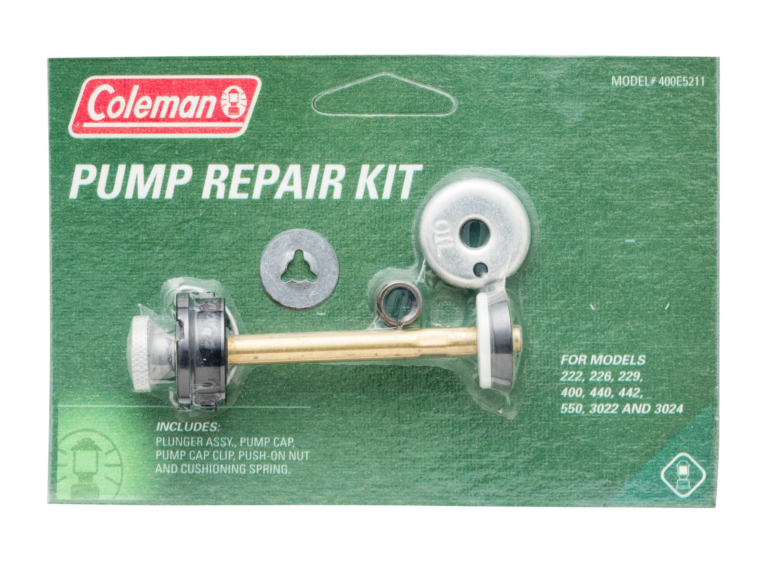 Give your fueled lantern a new lease on life with the Coleman® Pump Repair Kit. It includes everything you need for a successful repair: a plunger assembly, pump cap, pump cap clip, push-on nut, and cushioning spring. This kit is designed specifically for Coleman lantern model 226 and stove models 442 and 550. Model numbers for stoves can be found on the label inside the lid or legs; look for lantern model numbers on the product label.
