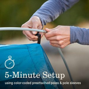 • QUICK SETUP: Sets up in 5 minutes using preattached poles; front left corner on tent and rainfly and brow pole sleeve are color coded red to help aid in fly orientation and setup