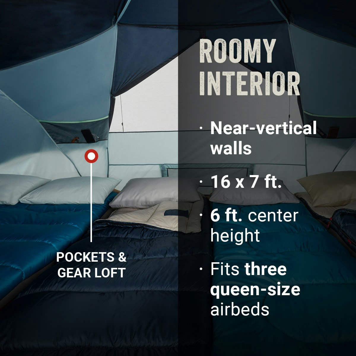 • Extended interior space fits 3 queen airbeds